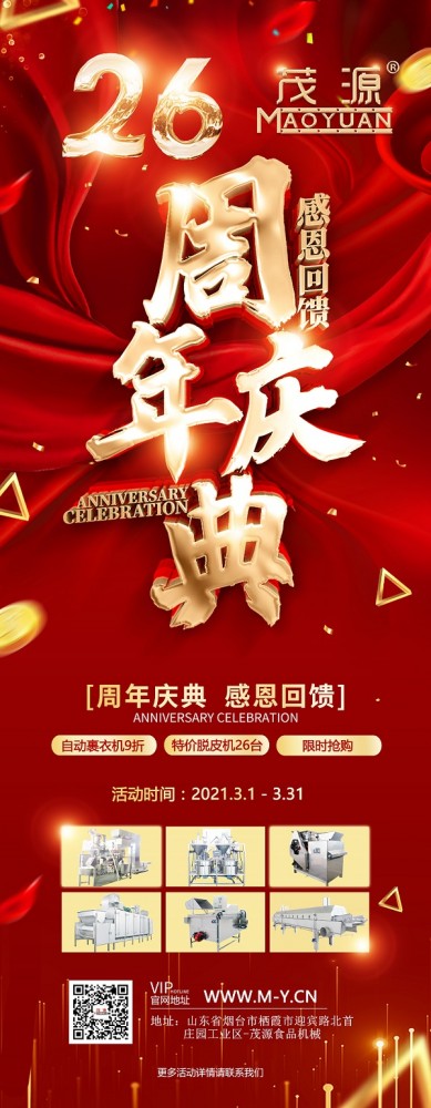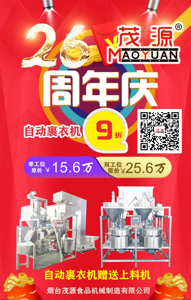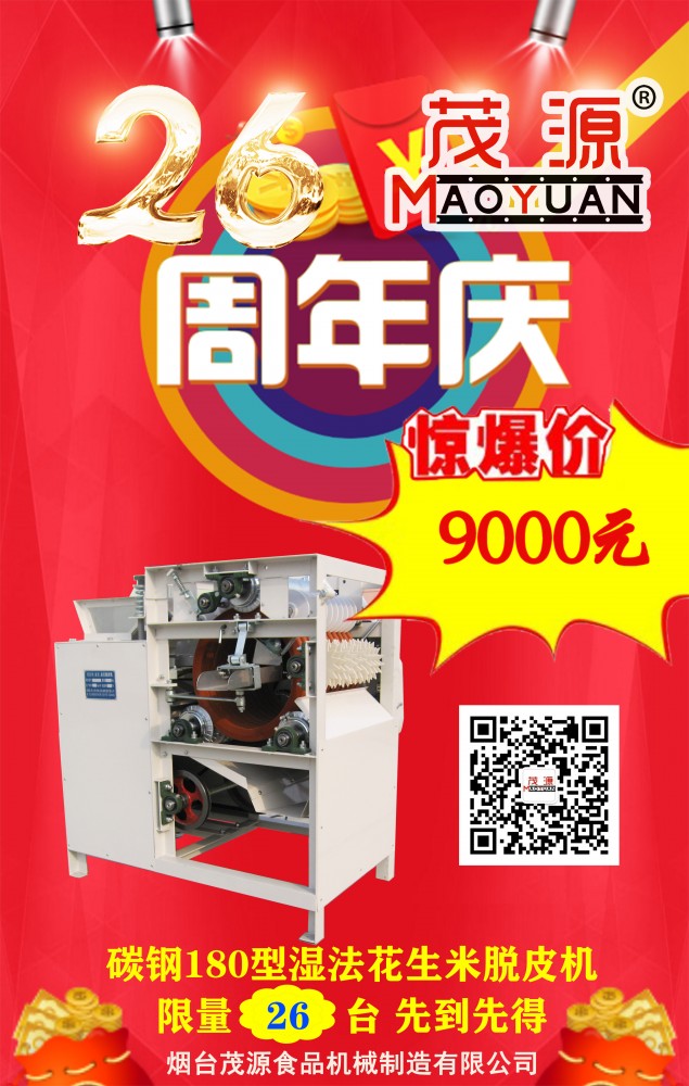 煙臺(tái)茂源食品機(jī)械即將迎來(lái)26周年慶,為感謝新老客戶長(zhǎng)期以來(lái)的支持與信任,現(xiàn)特推出以下感恩回饋活動(dòng):?jiǎn)喂の弧㈦p工位自動(dòng)裹衣機(jī)原價(jià)15.6萬(wàn)元、25.6萬(wàn)元基礎(chǔ)上降價(jià)10%,并隨機(jī)贈(zèng)上料機(jī);碳鋼180型濕法花生米脫皮機(jī)特價(jià)9000元,限量26臺(tái),先到先得!